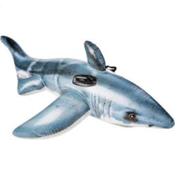 Kids Inflatable Ride-on Pool Toy. Great White Shark Ride-On 68"" x 42"" (1.73mm x 1.07m). 2 Heavy duty handles. Innovative photo-realistic printing create look of actual shark! Repair patch. 88 lb (40 kg) max weight limit. 10 ga (0.25mm) vinyl. Packaged in an attractive shelf box. Age 3+. 6 per case.