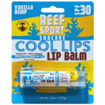 REEF LIP "VANILLA" SPF 30.5 - CARDEDReef Sport "Cool Lips" Lip Protection SPF 30.5 - .15z This is part of our new "Pt.5" exclusive series in Lip / Sprays / Zinc- Flavor - Vanilla Hemp Fair Trade Certified™, Gluten-Free, Cruelty-Free / Recyclable Packaging Protect Your Lips With Broad Spectrum UVA/UVB SPF 30.5 "Cool" Lip Balm. Formulated With Organic Aloe Vera, Fair Trade Certified Organic Coconut Oil & Cocoa Butter, and Vanilla To Soothe And Moisturize. Reef Sport "Cool Lips" Balm Helps Prevent Sunburn And Damage From UVA/UVB Rays. A Must For Any Outdoor Adventure. Ingredient Highlights- Soothes Skin: Organic aloe vera soothes the lips. Skin Nourishing:?Organic, Fair Trade Certified™ coconut oil is highly effective at providing moisture to the skin and ensures fair wages & safe working conditions for the organic farmers. Broad Spectrum Protection: protects from harmful UVA/UVB rays Medicated: Prevent dryness, cracking, and chapping with this "cool lips" product that has an easy glide formula to provide complete coverage and will help avoid further irritation of chapped lips.